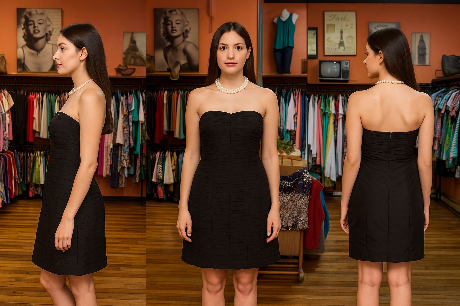 Este impactante vestido mini negro de corte strapless (sin tirantes) es la pieza perfecta para cualquier ocasión que requiera un toque de sofisticación y modernidad. Su diseño está meticulosamente elaborado para realzar la figura con una textura única y un ajuste impecable.